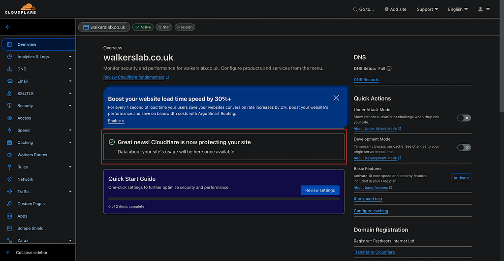Now your site has been added to Cloudflare, you’ll now be able to take full advantage of all the features. Cloudflare offers a range of features including a content delivery network (CDN) to speed up website loading times, DDoS protection to guard against cyber attacks, web application firewall (WAF) for enhanced security, and DNS services for reliable domain name resolution.