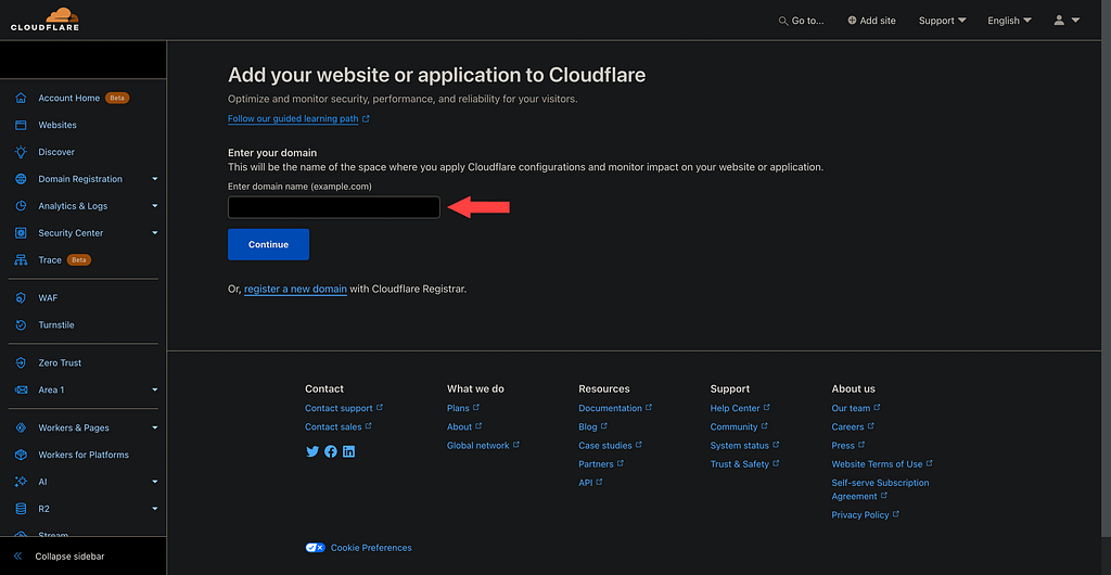 Now enter the domain name which you would like to add to Cloudflare. Then press Continue.