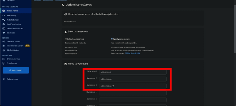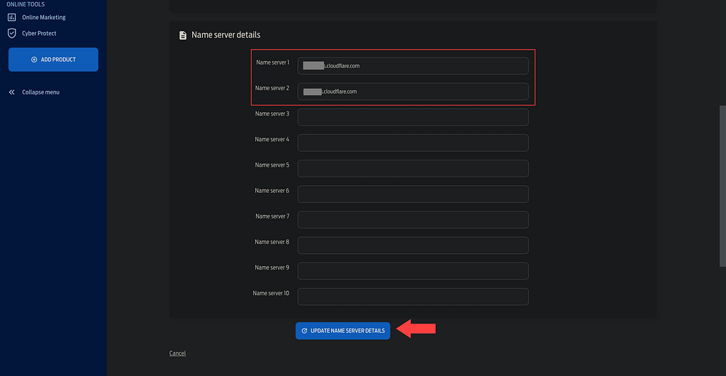 Paste the two nameservers into the first two fields. Once pasted click on “Update Name Server Details”.