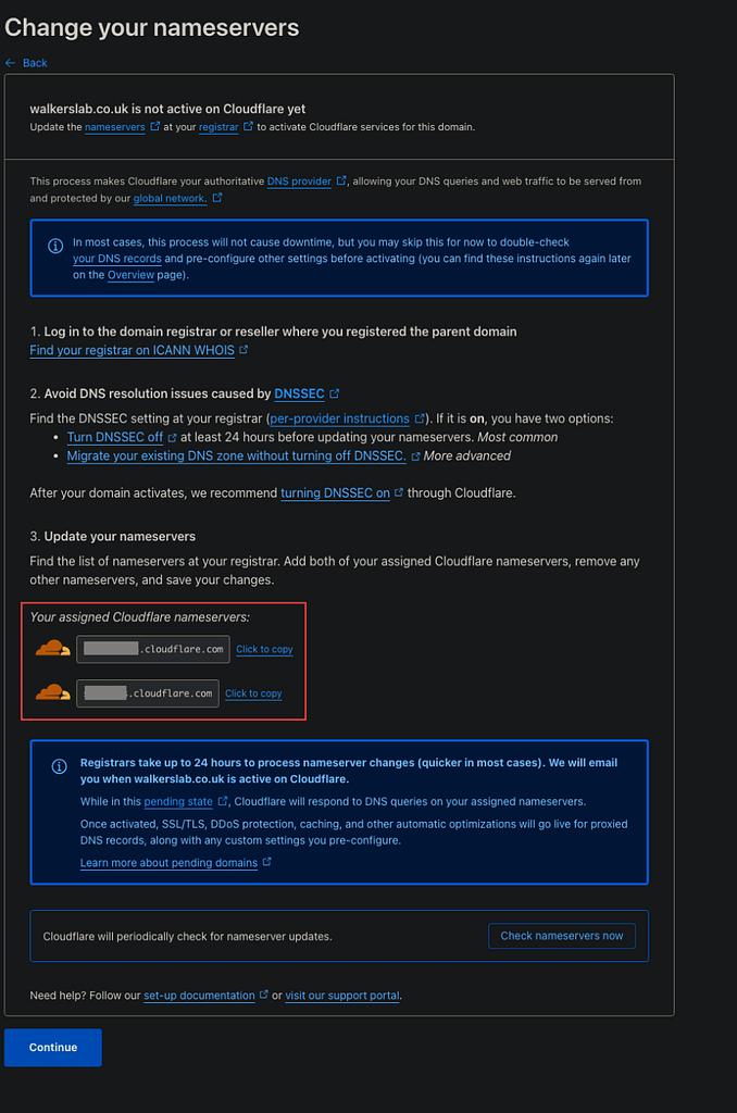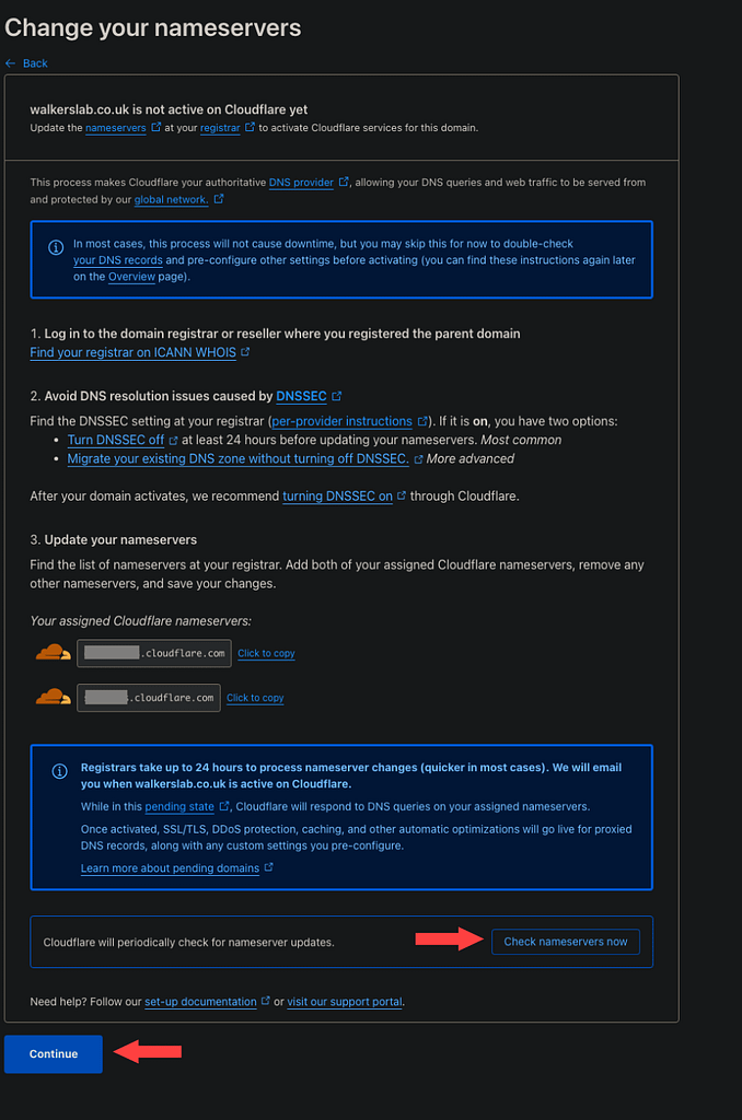 Navigate back to the Cloudflare page and click on “Check nameservers now”. The click on “Continue”.