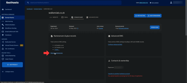 Click on “Manage nameservers”. On this page you’ll find your current nameservers and will have the ability to change them.