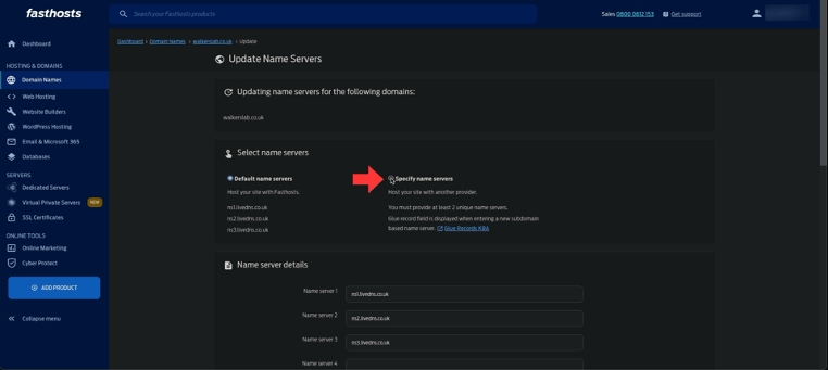 You’ll then be given the Cloudflare name servers which you need to set in your domain name registrar. Copy the two nameservers provided. Once copied navigate back to page we left open on FastHosts.