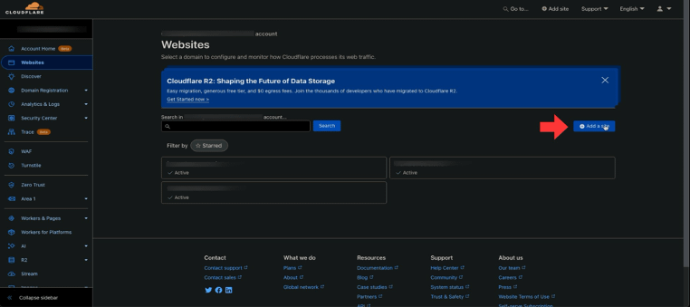 To add a new domain to Cloudflare, start by clicking “Add a site”.