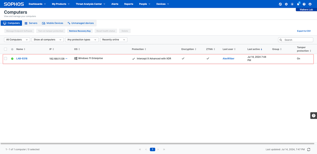 You can also verify the application has been installed by logging into your Sophos Central dashboard, navigating to Devices and looking for the Hostname of a device which has the application assigned to it.