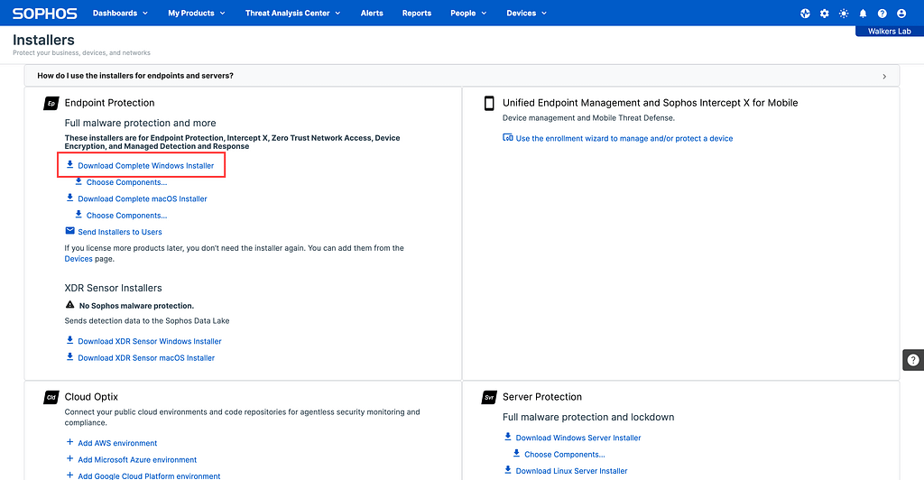 Login to your Sophos Central dashboard, then click on Devices then Installers.