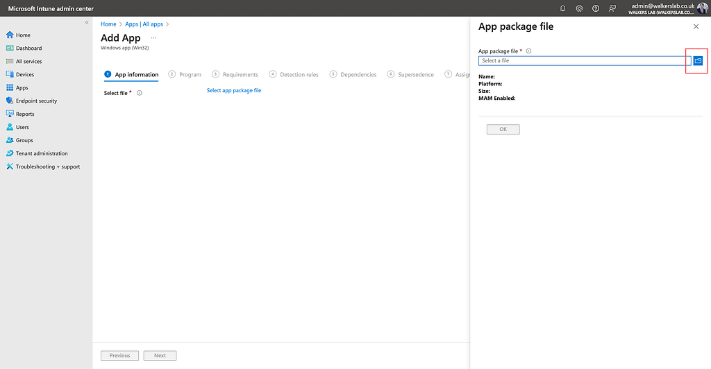 Click on the browse icon then select the intunewin file from your output folder.