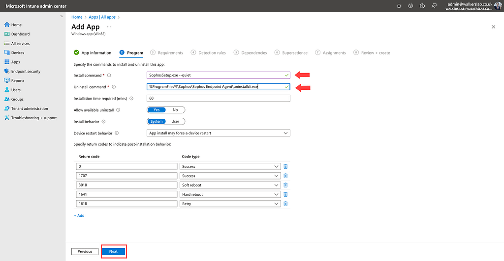 The next step is to specify the Install and Uninstall commands which Intune will use to install the application. Enter the following commands and leave the rest of the settings as default: