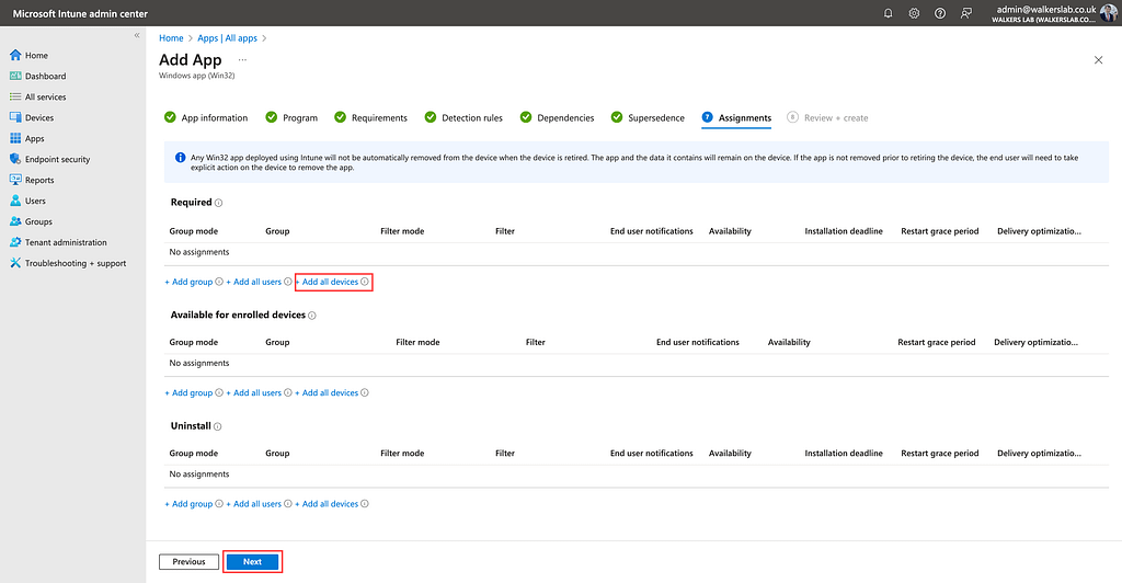 Within the Assignments section you can chose how the application is made available to devices. In my example I will be making Sophos required for all devices.