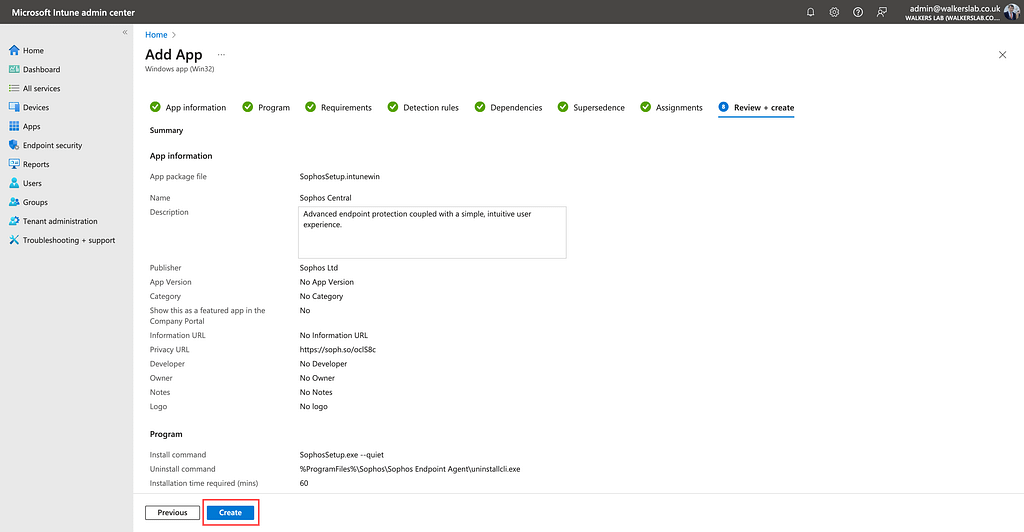 | Setup file | C:\users\admin\desktop\Intune App Creator\source\sophos endpoint\sophossetup.exe |