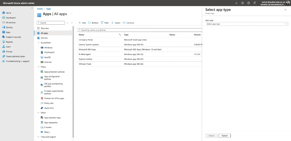 Login to the Intune Admin Centre and click on “Apps” then “All apps” then “Add”.